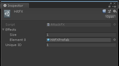 Attack FX assets only contain an array of prefabs (of attack effects you create) and a unique identifier you give it. Add more than one prefab to the array if you want these effects to act as a group where only one is randomly selected. The unique identifier should be greater than zero. Attack FX are sorted by their unique identifier in the editor UI.