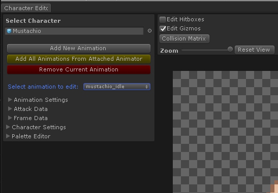 The settings window lets you define animation events, hitbox types, hitbox colors, and define how hitboxes will interact with each other.