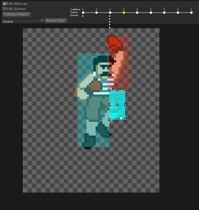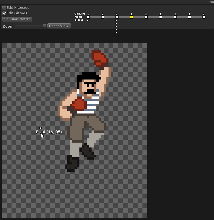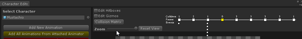 For more static animations like an idle animation you might not want to update the hitboxes for that character every frame. By middle clicking a frame in the timeline you tell the character to keep any hitboxes it already has from the previous frame. Frames that will skip a hitbox update display their collider count as “>” in the timeline.